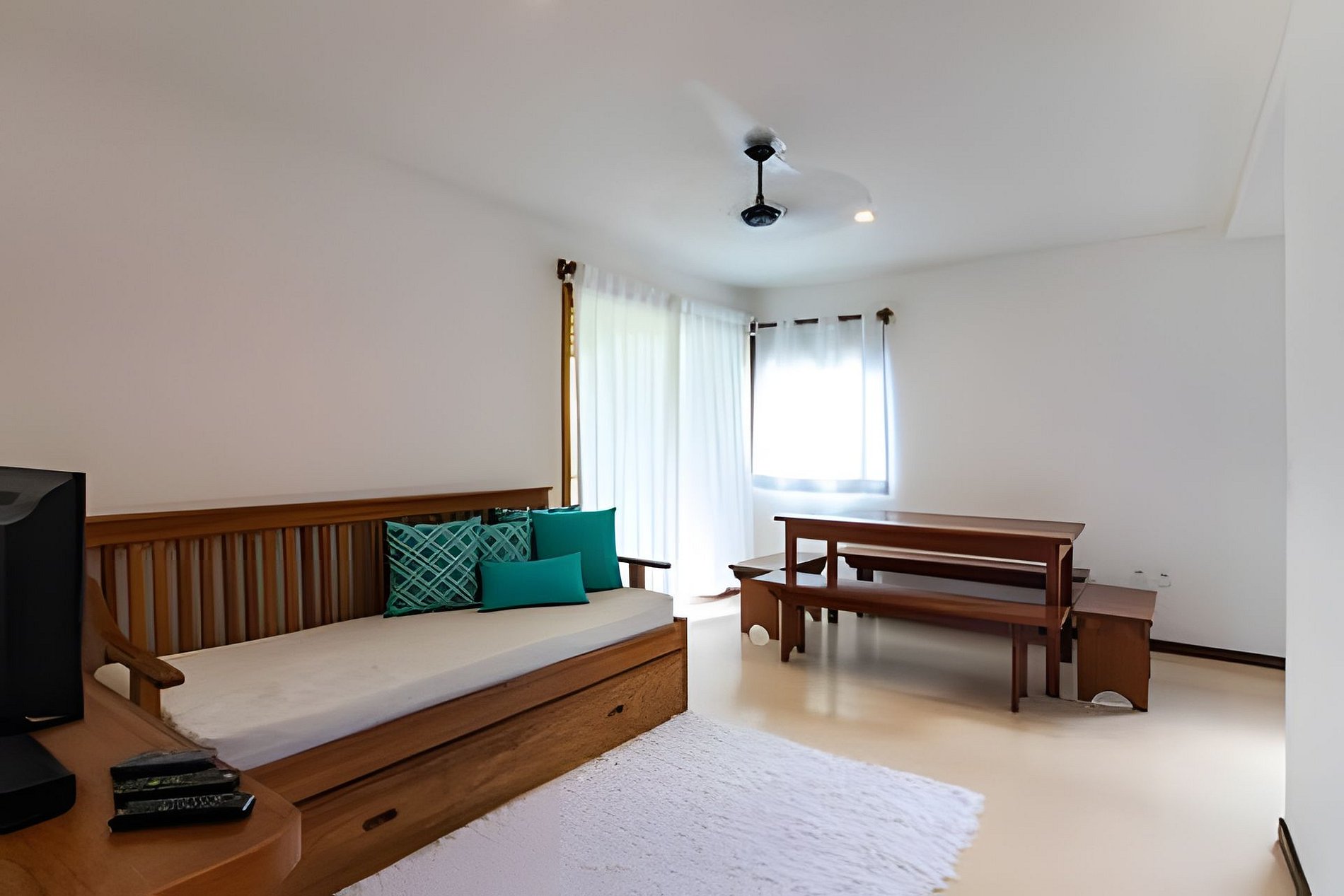 O apartamento é muito aconchegante e espaçoso , mede cerca de 120 mq no andar terréo , dividido em uma sala com sofá bicama cozinha completamente montada , uma suites com ar condicionado um quarto com cama box e banheiro social , uma ampla varanda com vista para o jardim com mesa para jantar