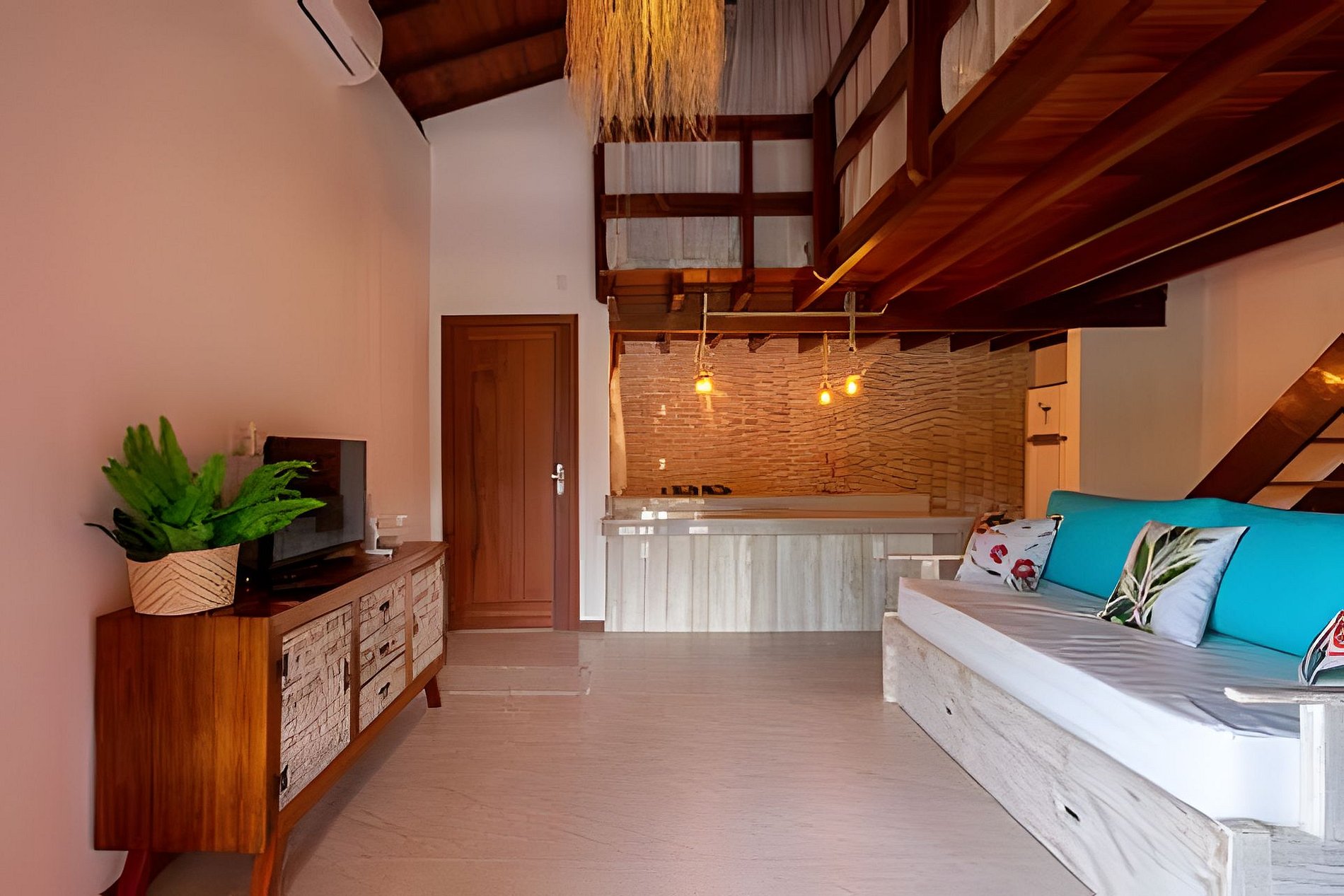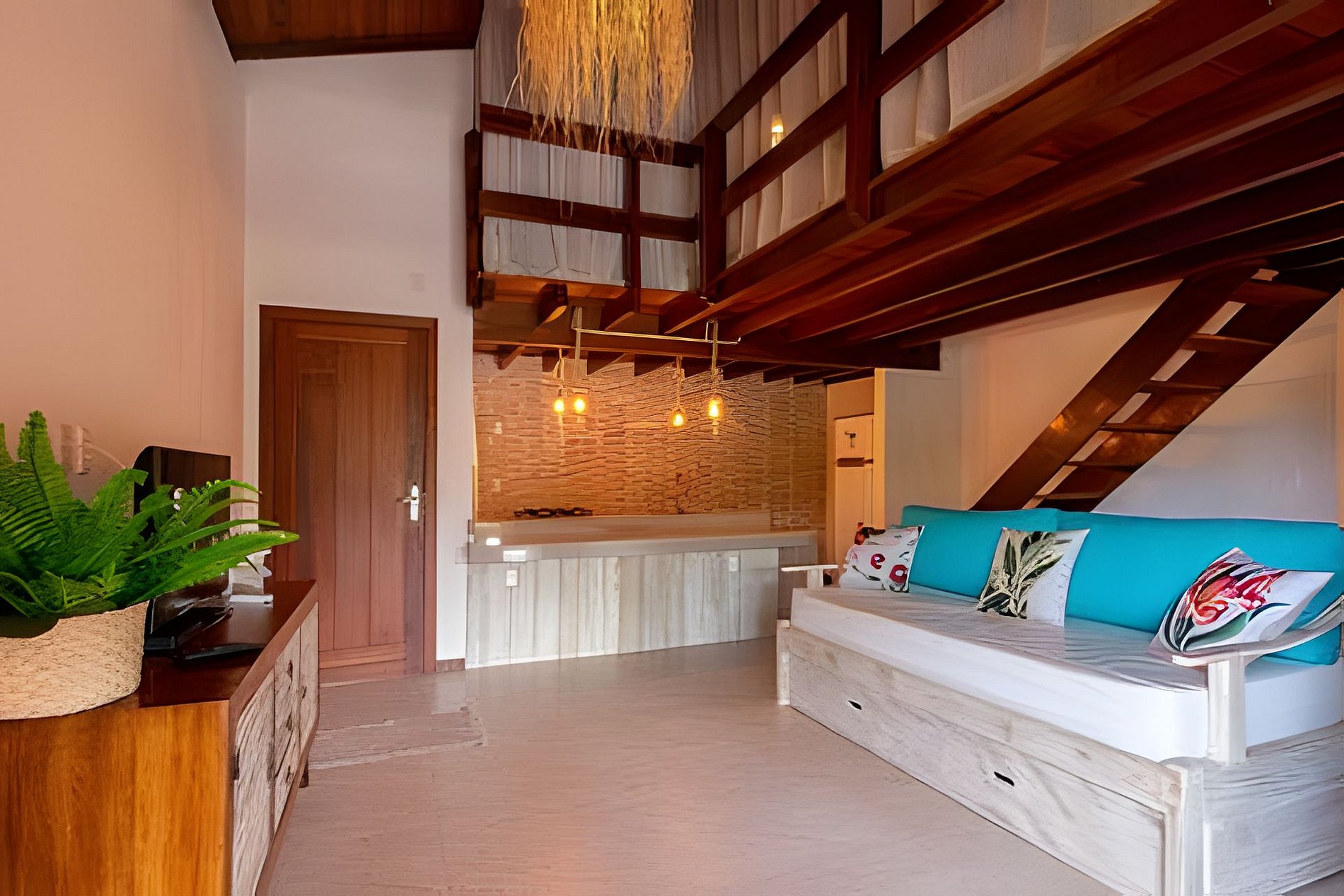 Trata-se de um apartamento de 03 quartos em primeiro andar. Sendo 1 suíte com cama casal e ar condicionado, armário e mosquiteiro, 1 quarto com cama casal, ar condicionado e mosquiteiro, 1 mezanino com cama casal, armário e ventilador. 1 banheiro social com chuveiro, pia, box de vidro e espelho. Cozinha equipada com cook-top 4 bocas, geladeira, micro ondas, liquidificador e utensílios básicos. Sala com sofá bicama, TV SMART e mesa de jantar com cadeiras.