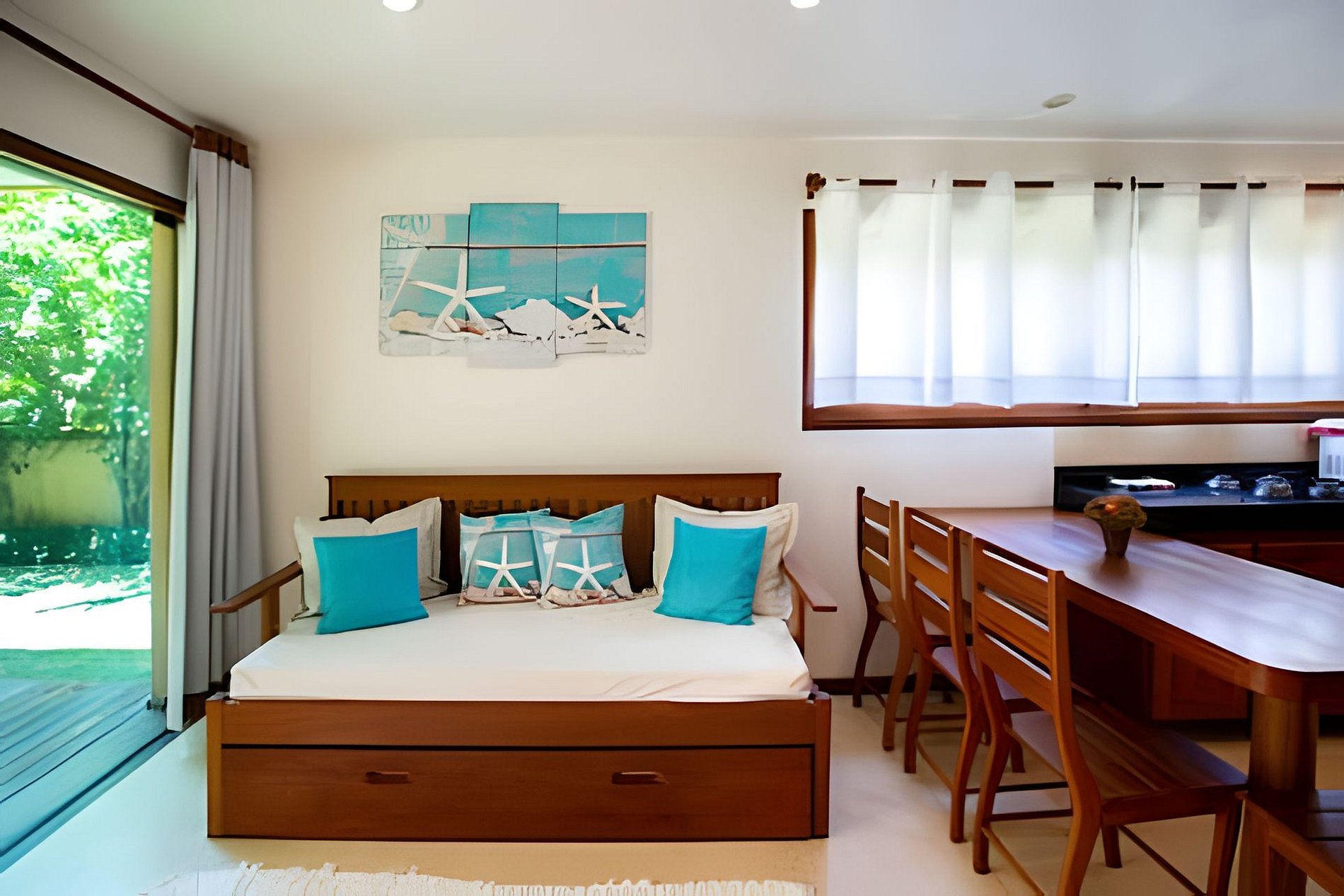 Apartamento térreo de um quarto com cama de casal e sofá bi-cama na sala com dois colchão de solteiro ideal para casal e duas crianças , cozinha completa , ampla varanda com rede .