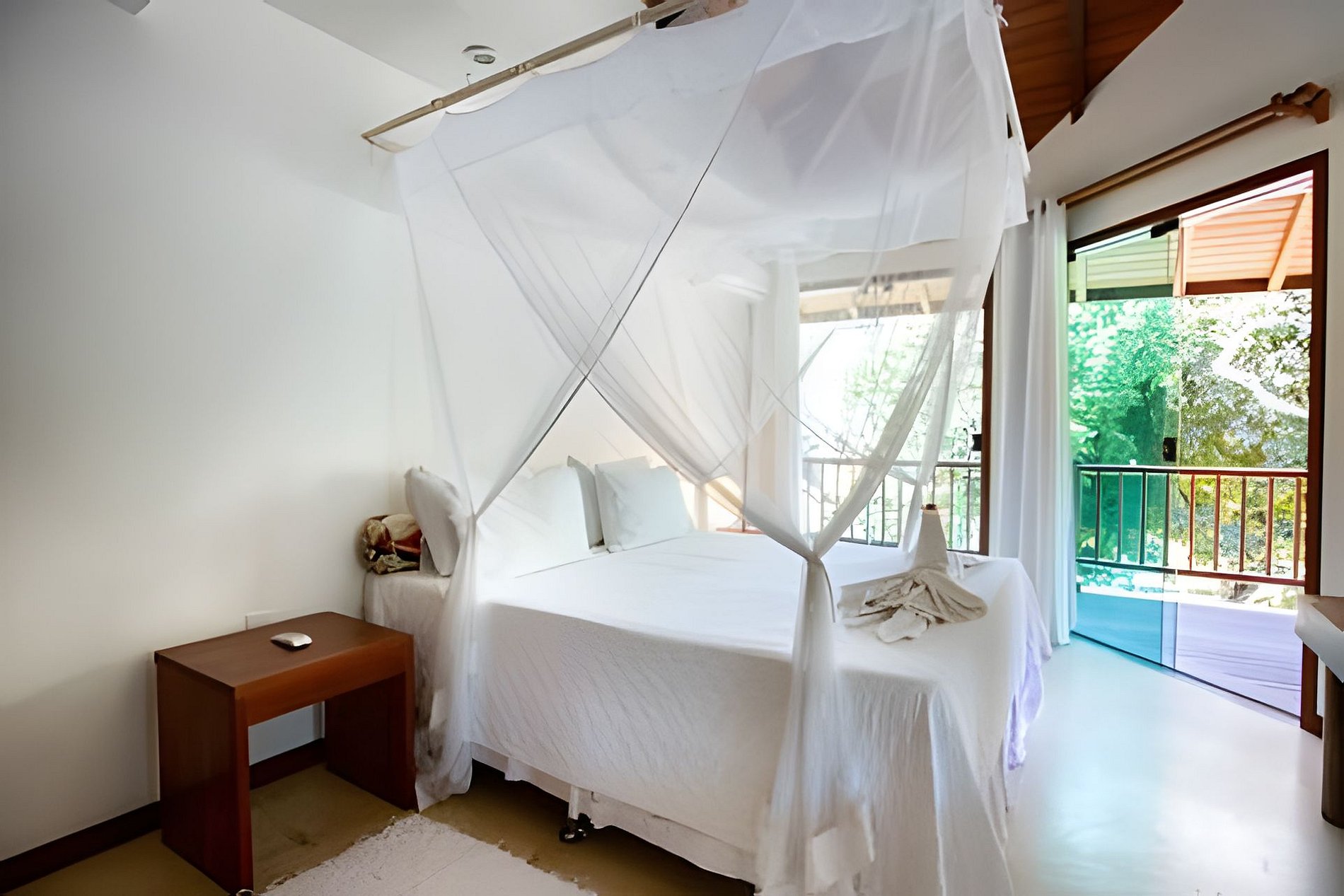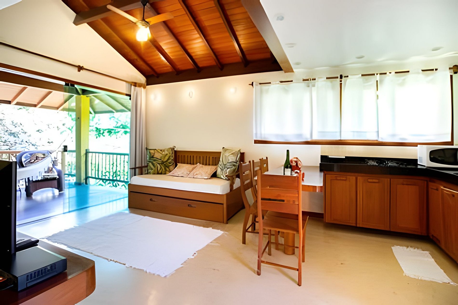 Apartamento superior com cerca de 70 mq de area total de um quarto com cama de casal queen , ar condicionado tipo split de 9000 BTU e sofá bi-cama na sala com dois colchão de solteiro com ventilador de teto ,banheiro com chuveiro , cozinha completa que consente a preparação de café da manha , almoço e janta , ampla varanda com rede .