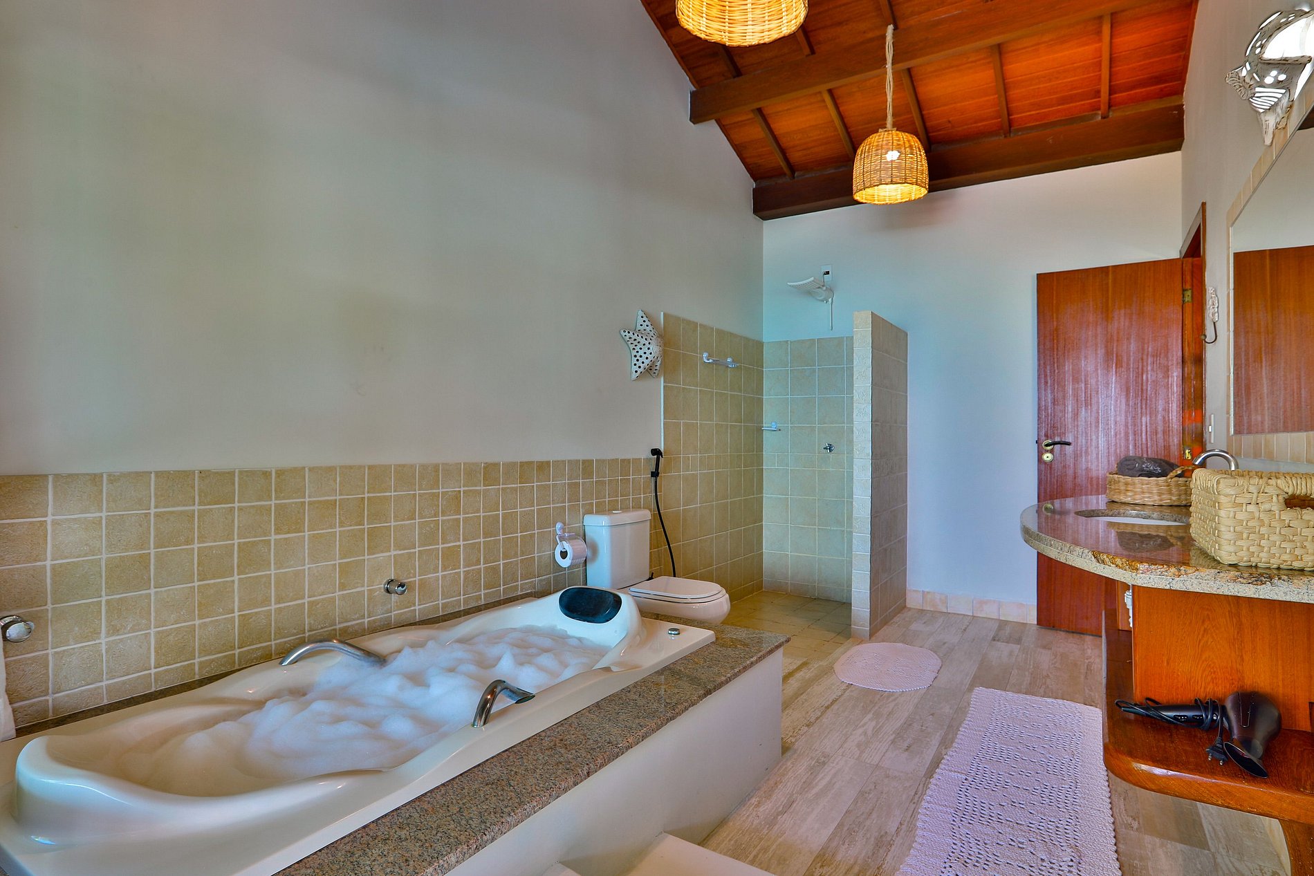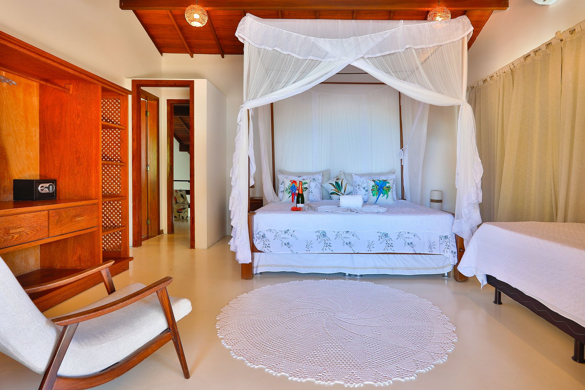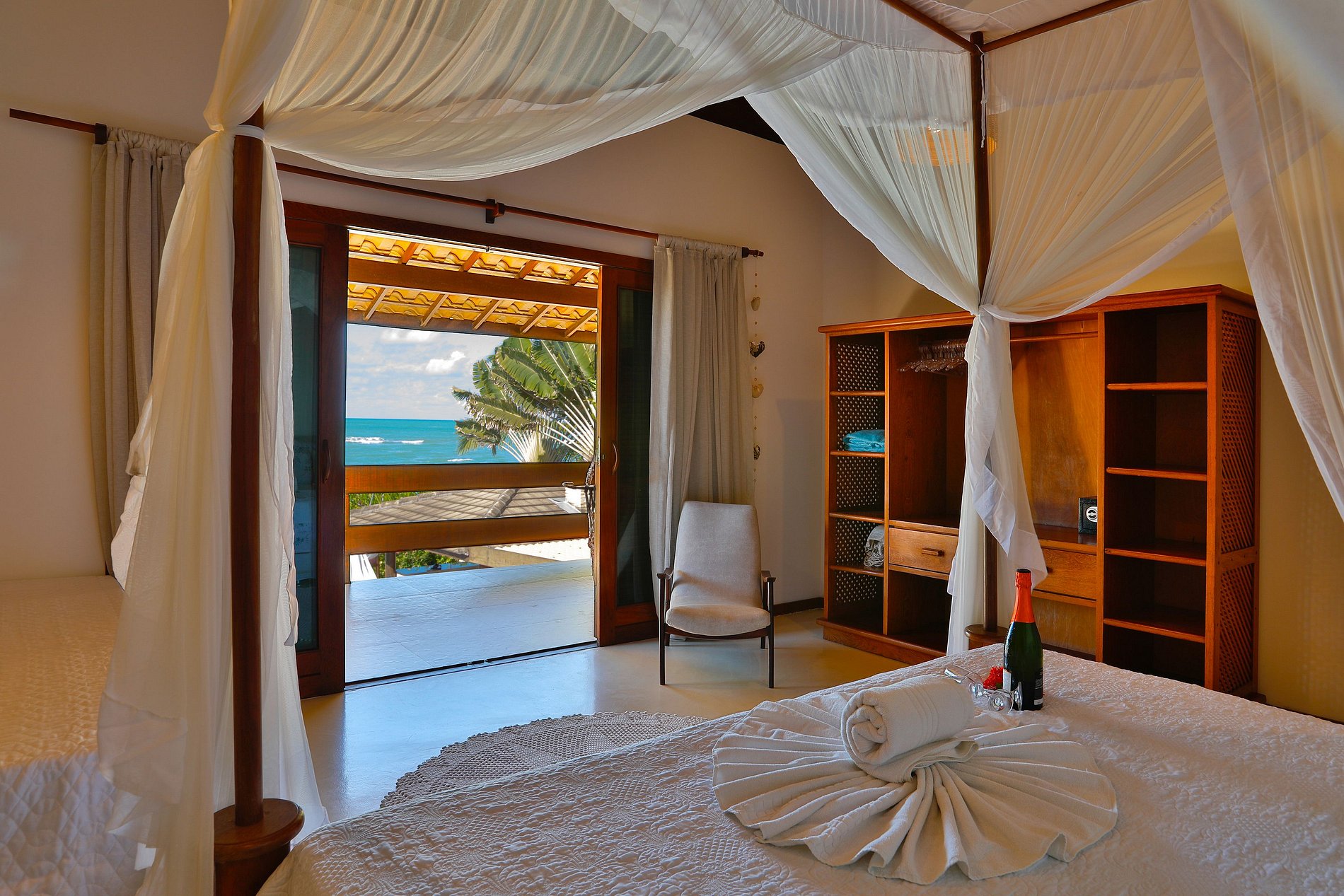 Piso superior : Uma suite master com cama king size e ar condicionado com vista para o mar e ampla varanda com vista para o mar ,no banheiro chuveiro ,e banheira hydromassagem com vista mar . Uma suite com cama casal queen ar condicionado e varanda com vista para o mar .