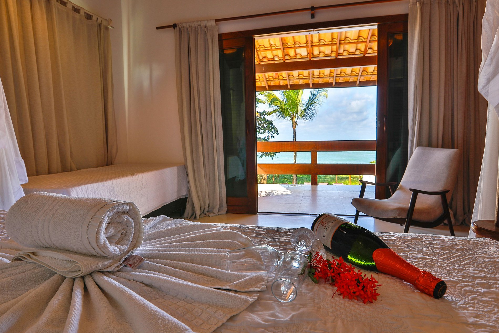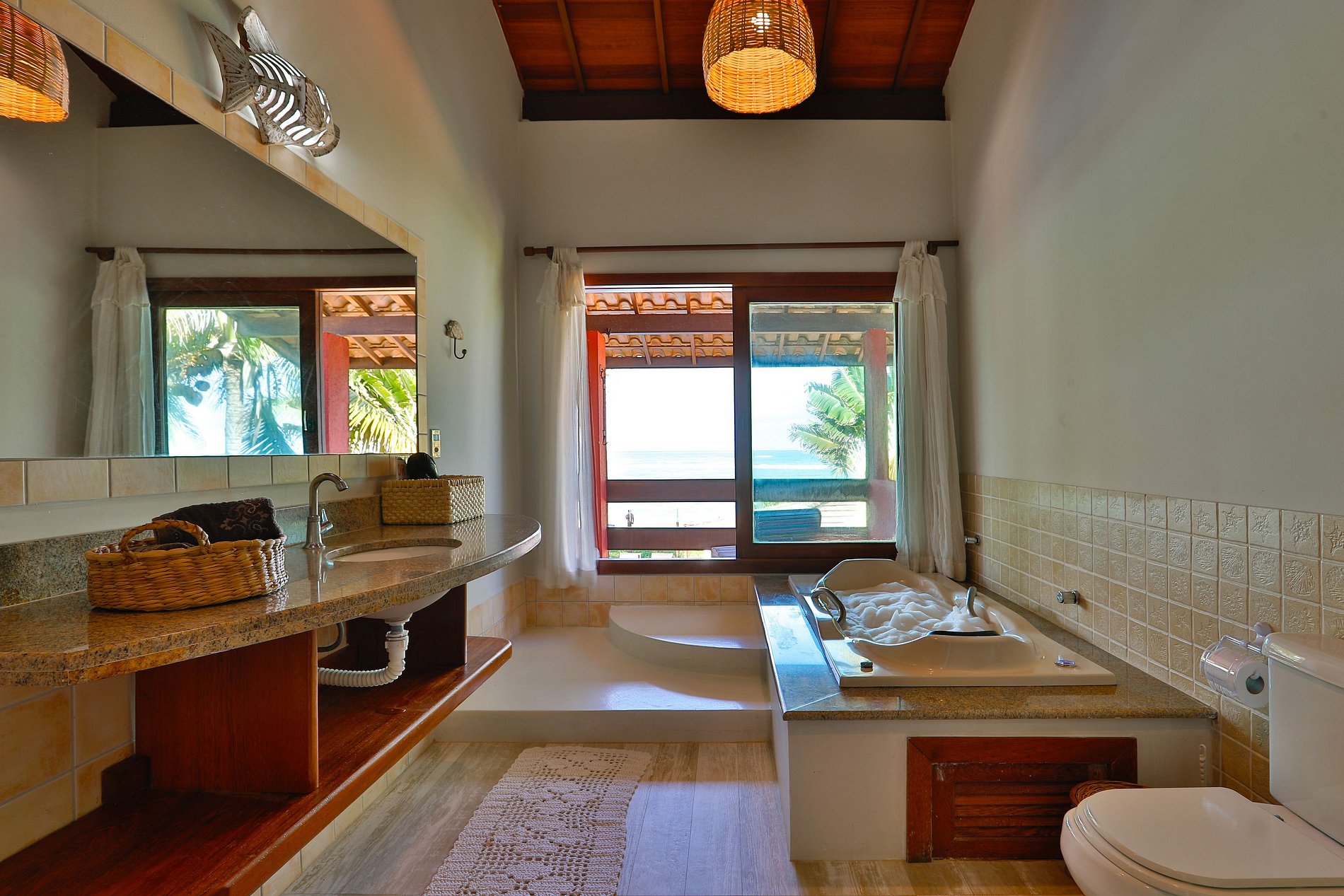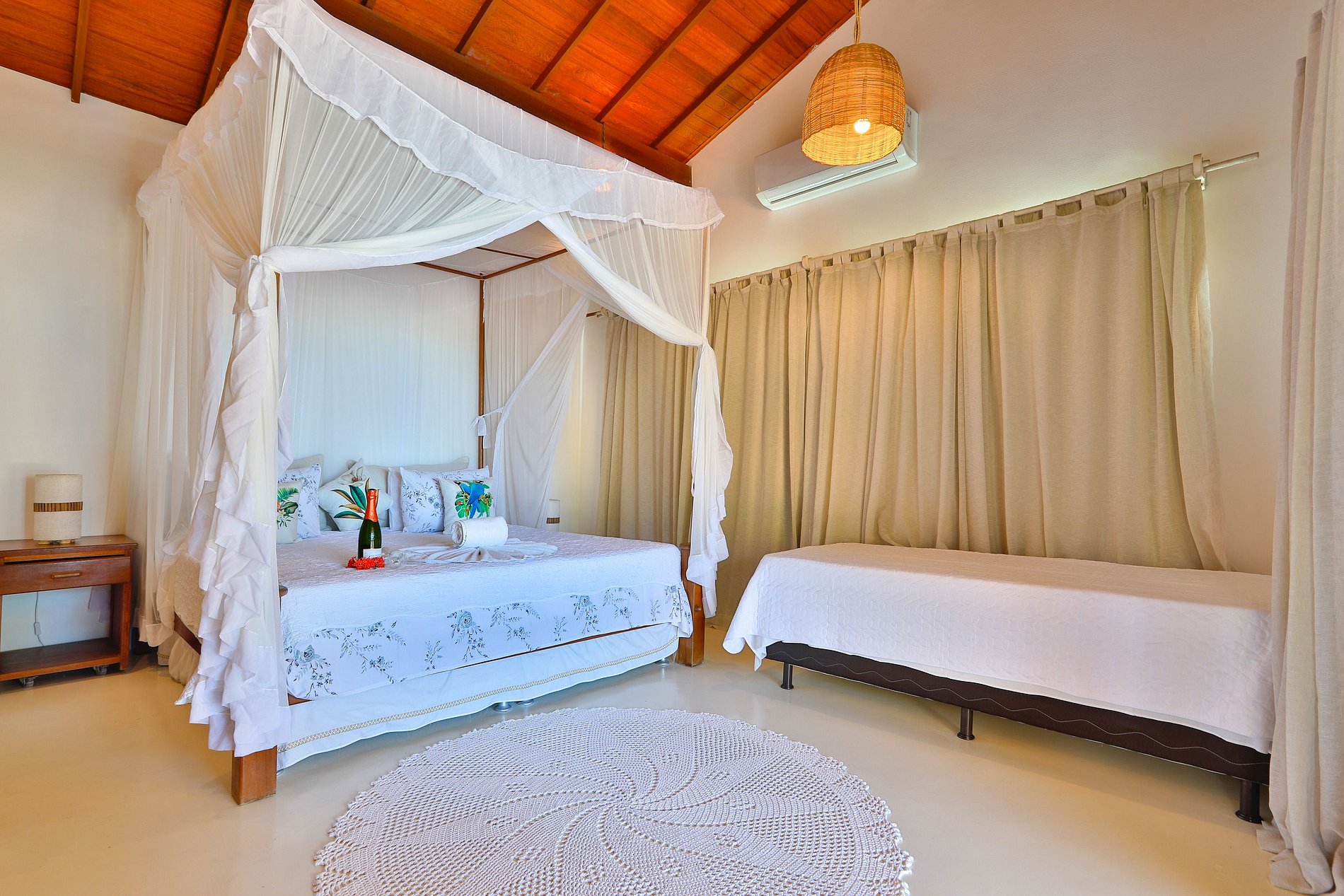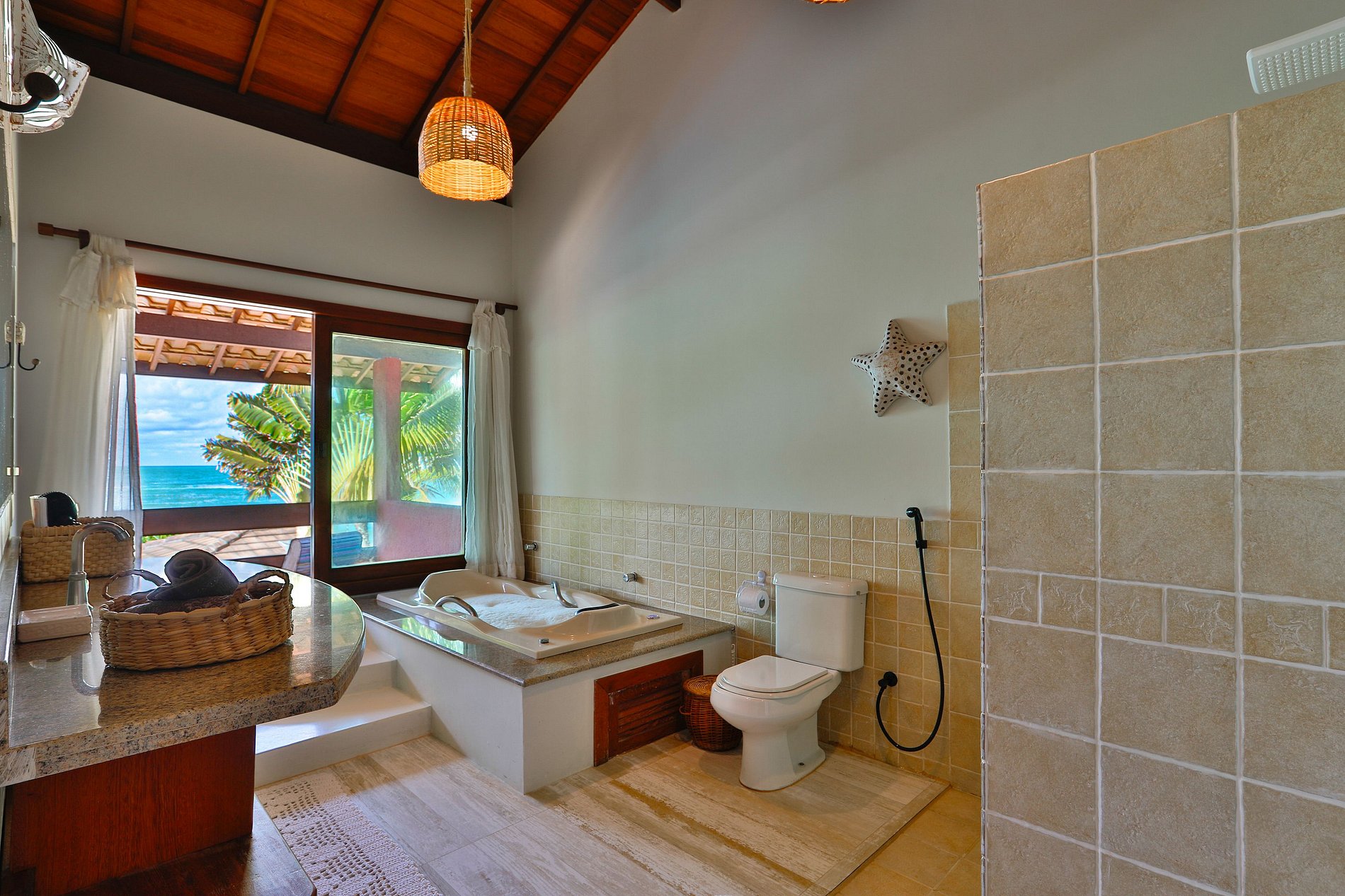 Piso superior : Uma suite master com cama king size e ar condicionado com vista para o mar e ampla varanda com vista para o mar ,no banheiro chuveiro ,e banheira hydromassagem com vista mar . Uma suite com cama casal queen ar condicionado e varanda com vista para o mar .
