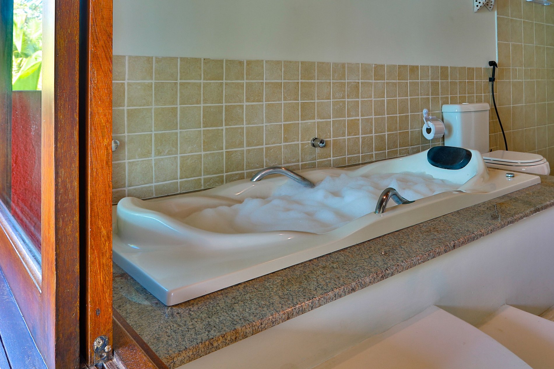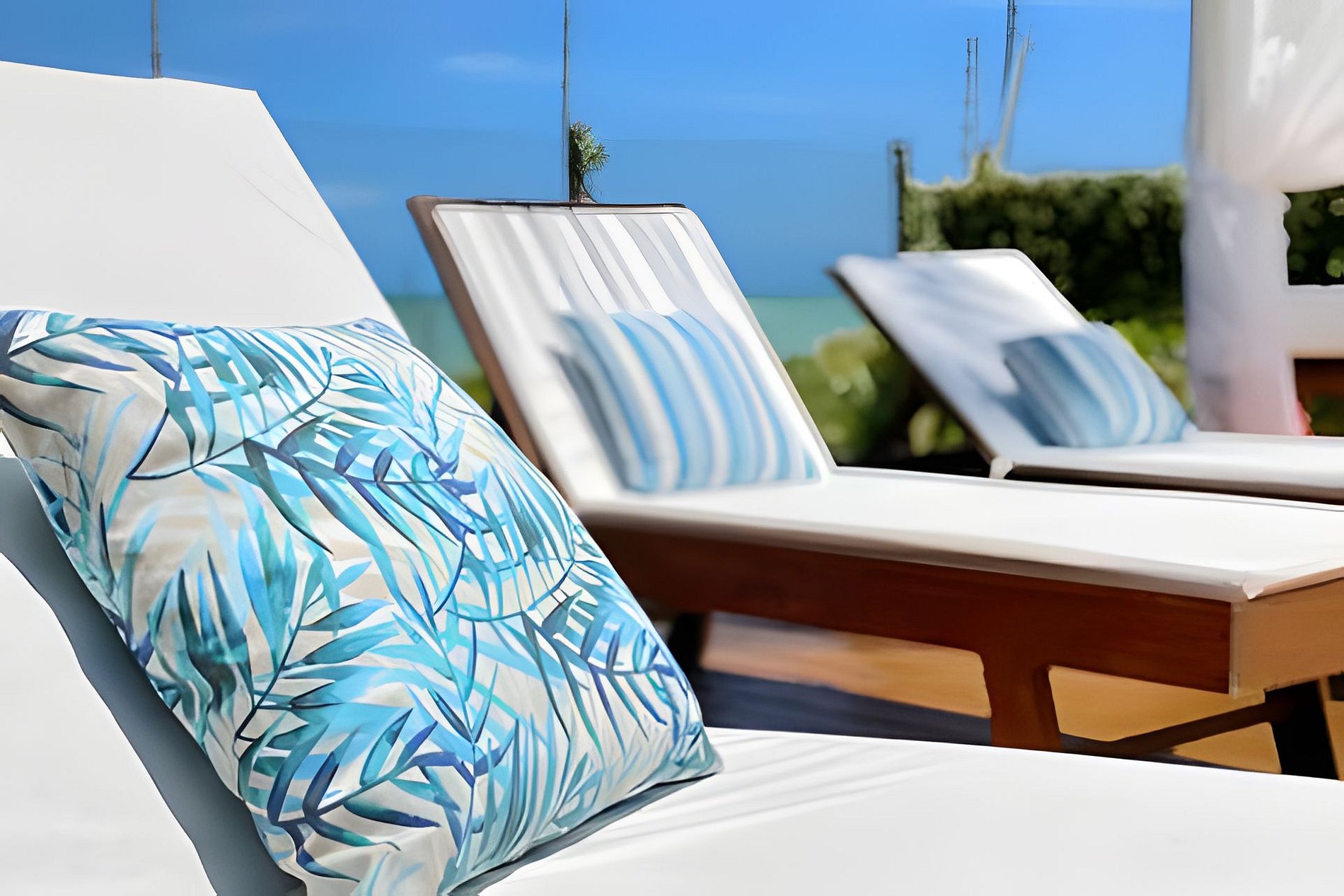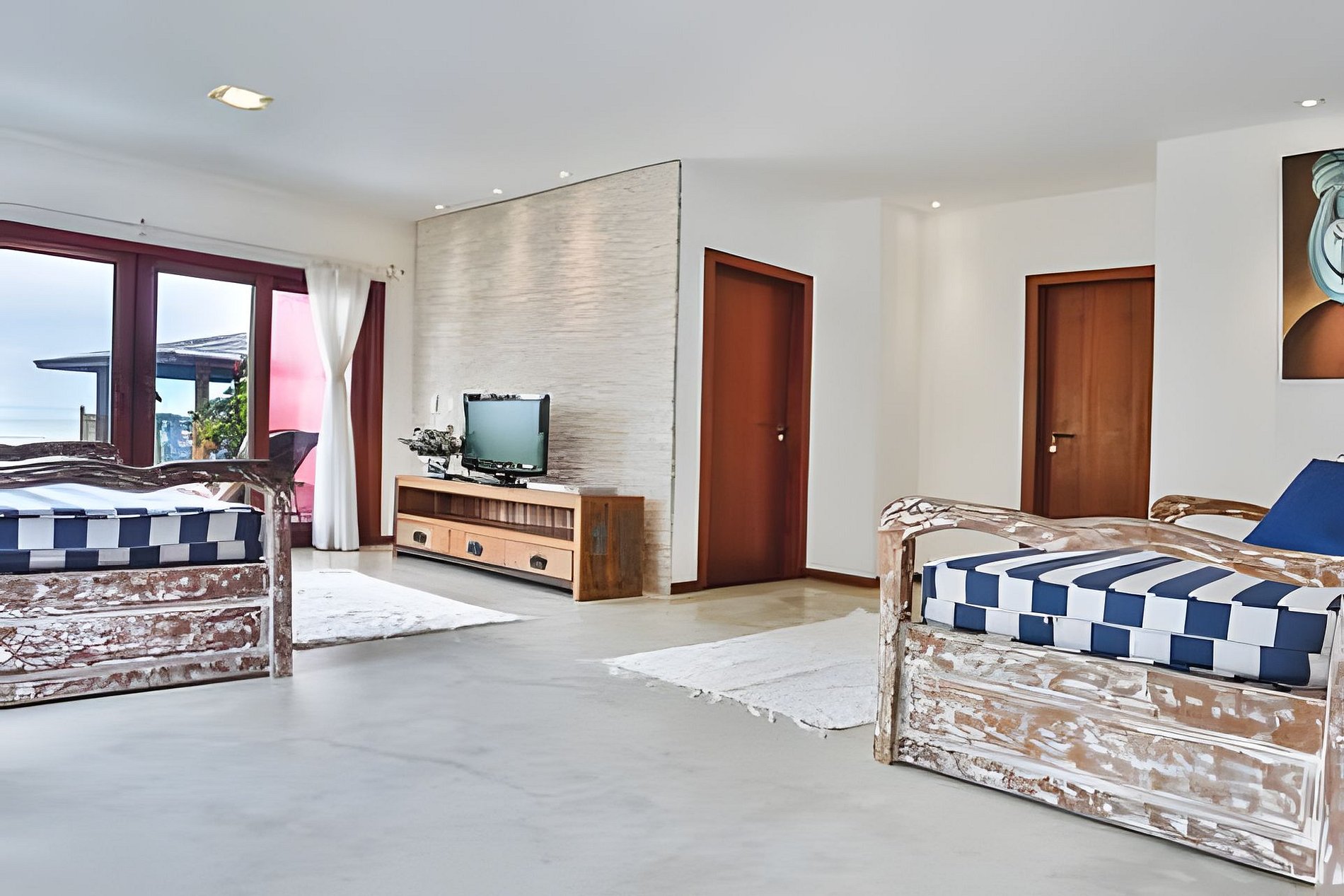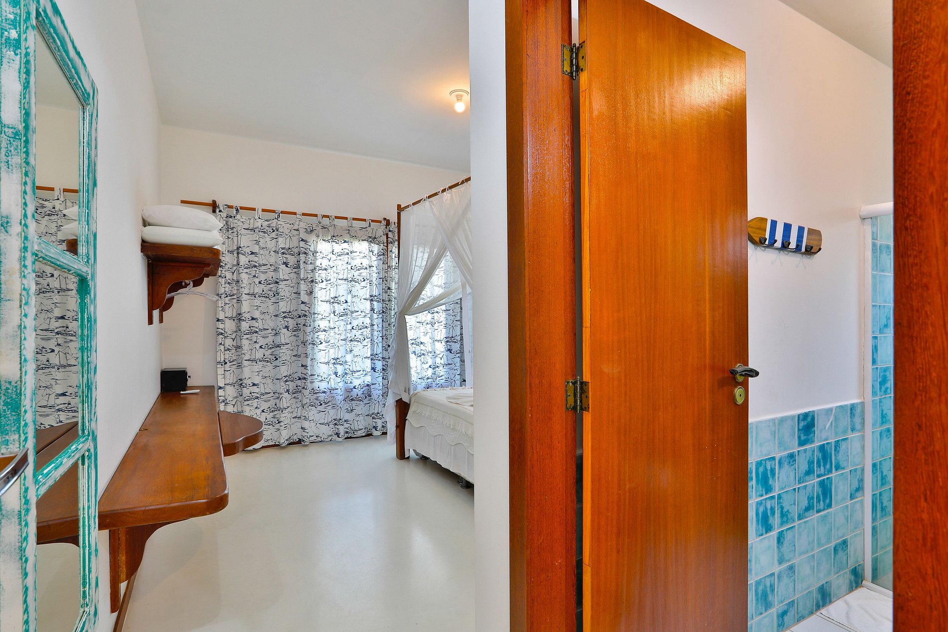 Piso superior : Uma suite master com cama king size e ar condicionado com vista para o mar e ampla varanda com vista para o mar ,no banheiro chuveiro ,e banheira hydromassagem com vista mar . Uma suite com cama casal queen ar condicionado e varanda com vista para o mar .
