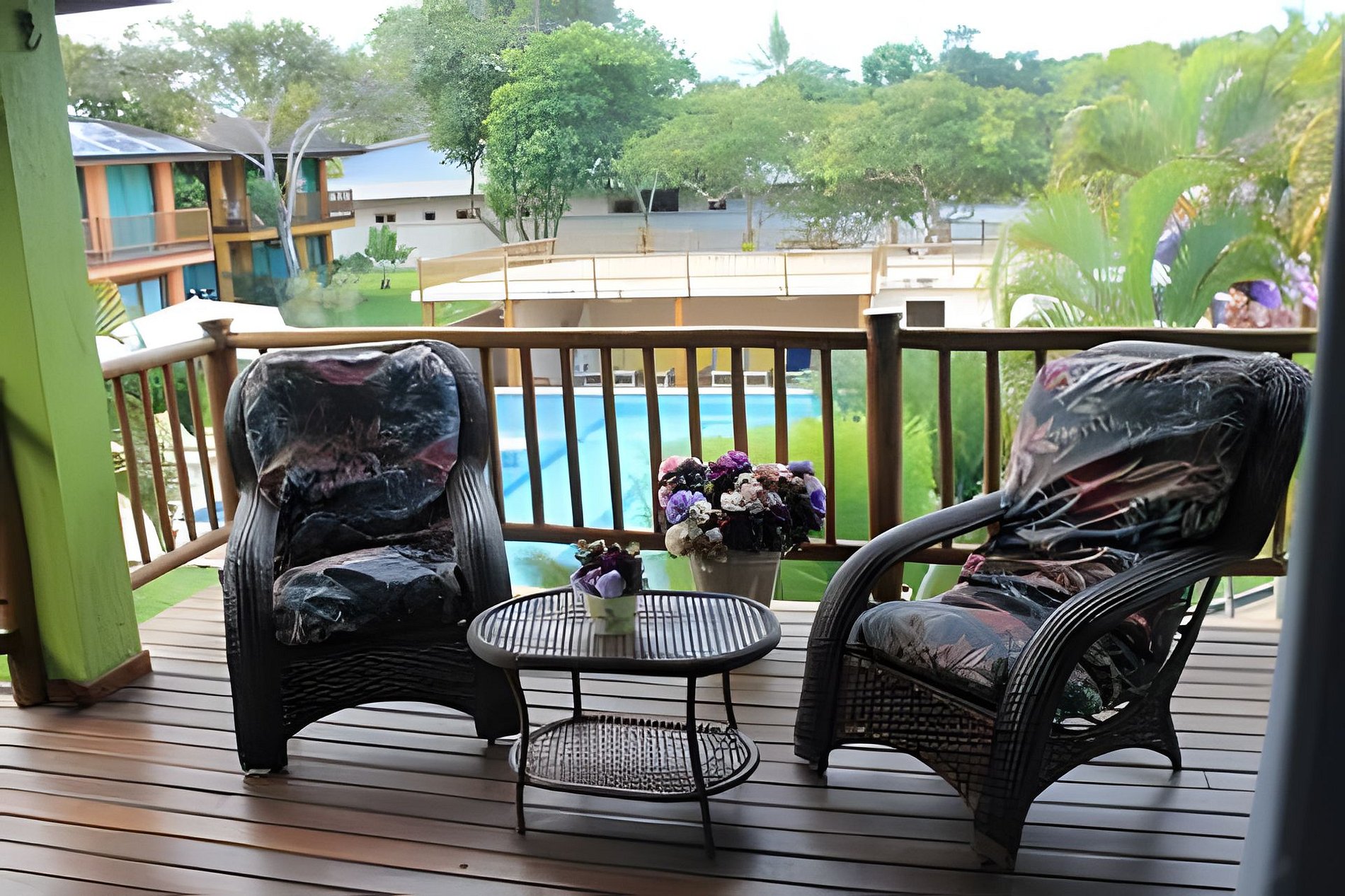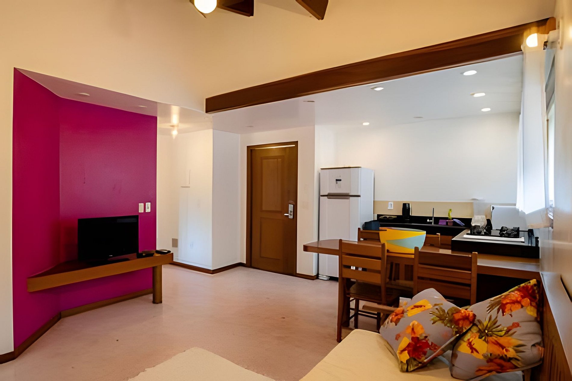 Apartamento superior de um quarto com cama de casal e sofá bi-cama na sala com dois colchão de solteiro ideal para casal e duas crianças , cozinha completa , ampla varanda com rede , com vista para piscina