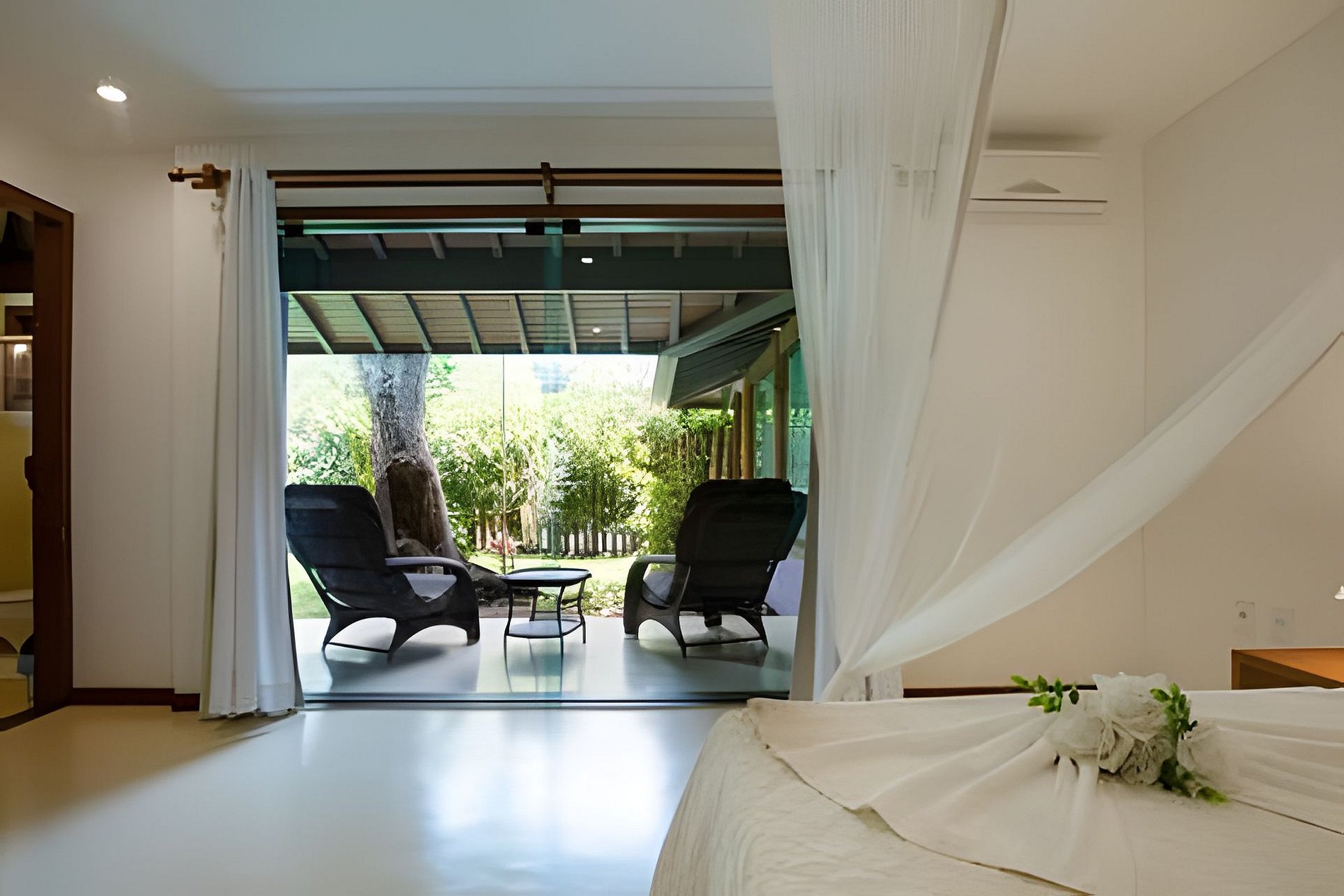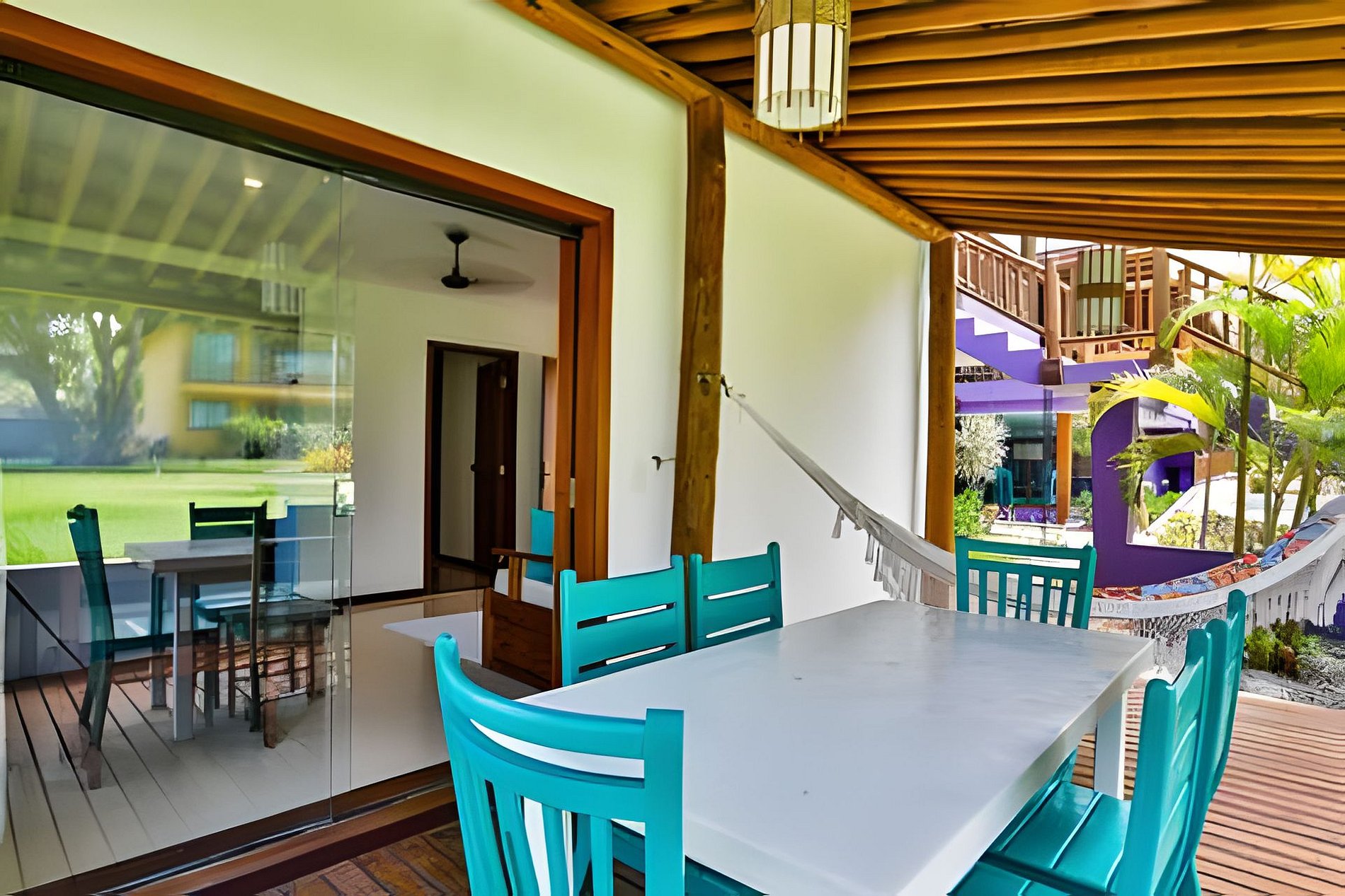 O apartamento é muito aconchegante e espaçoso , mede cerca de 120 mq no andar terréo , dividido em uma sala com sofá bicama cozinha completamente montada , uma suites com ar condicionado um quarto com cama box e banheiro social , uma ampla varanda com vista para o jardim com mesa para jantar