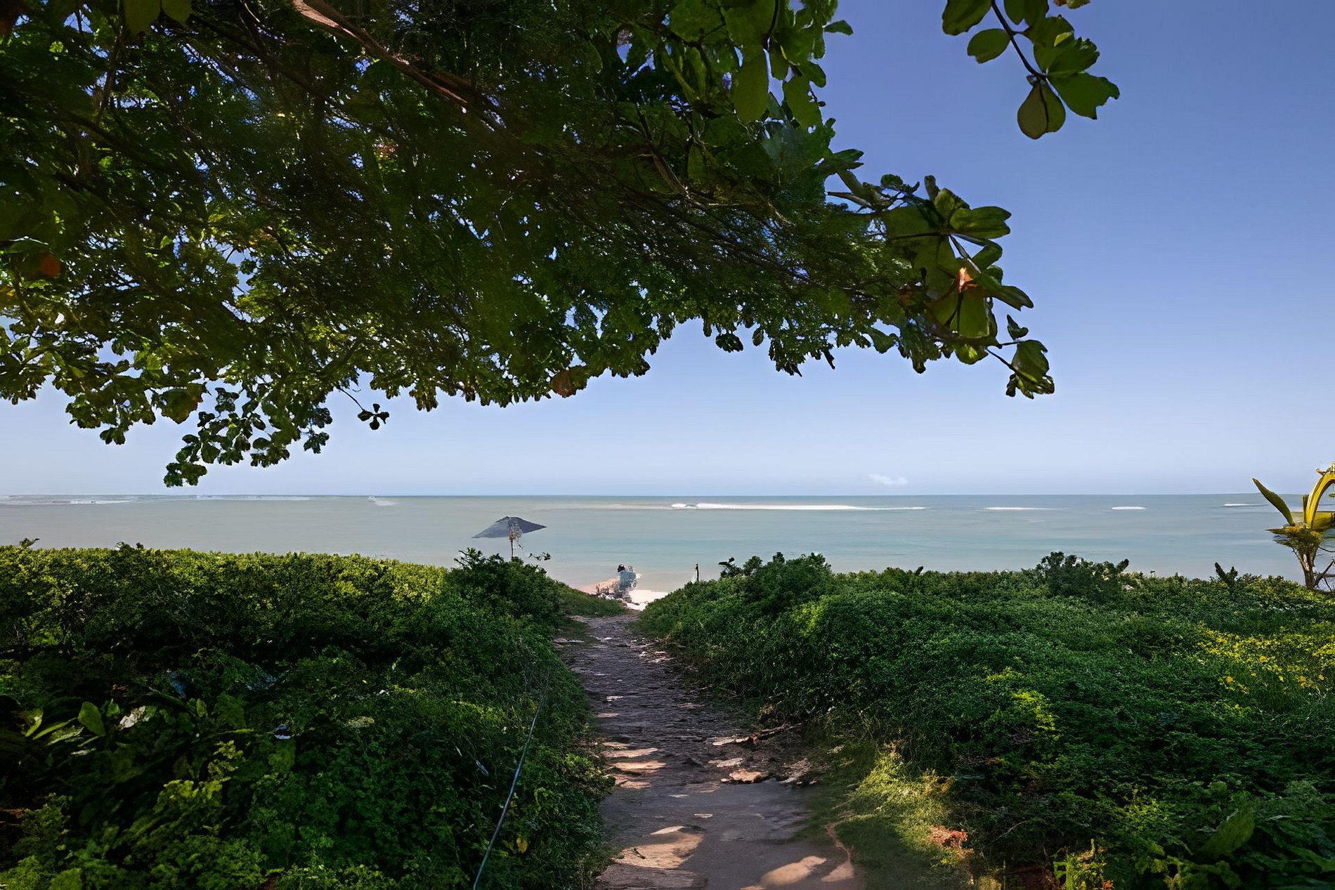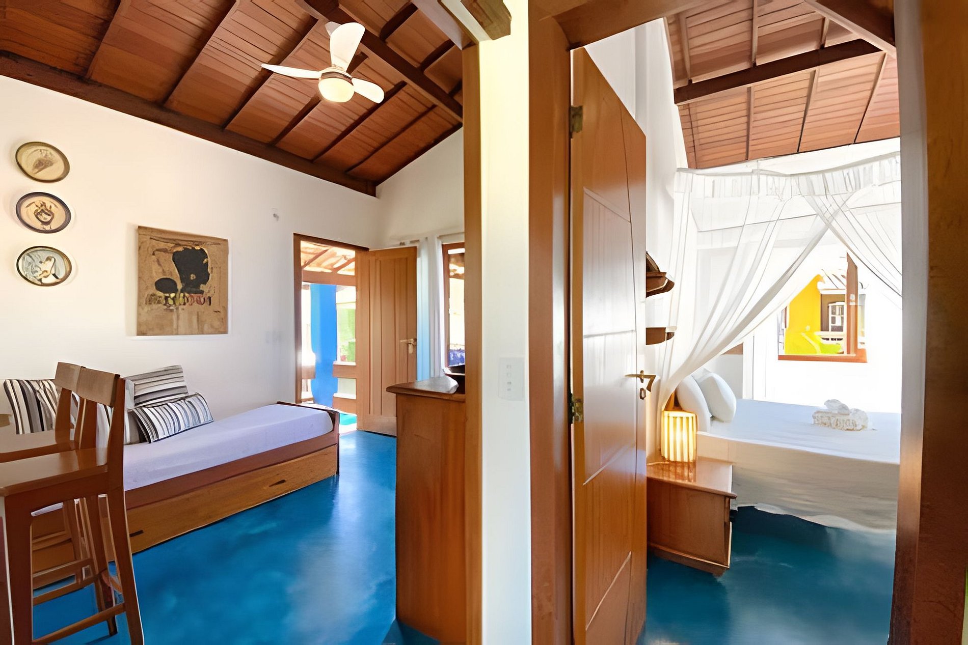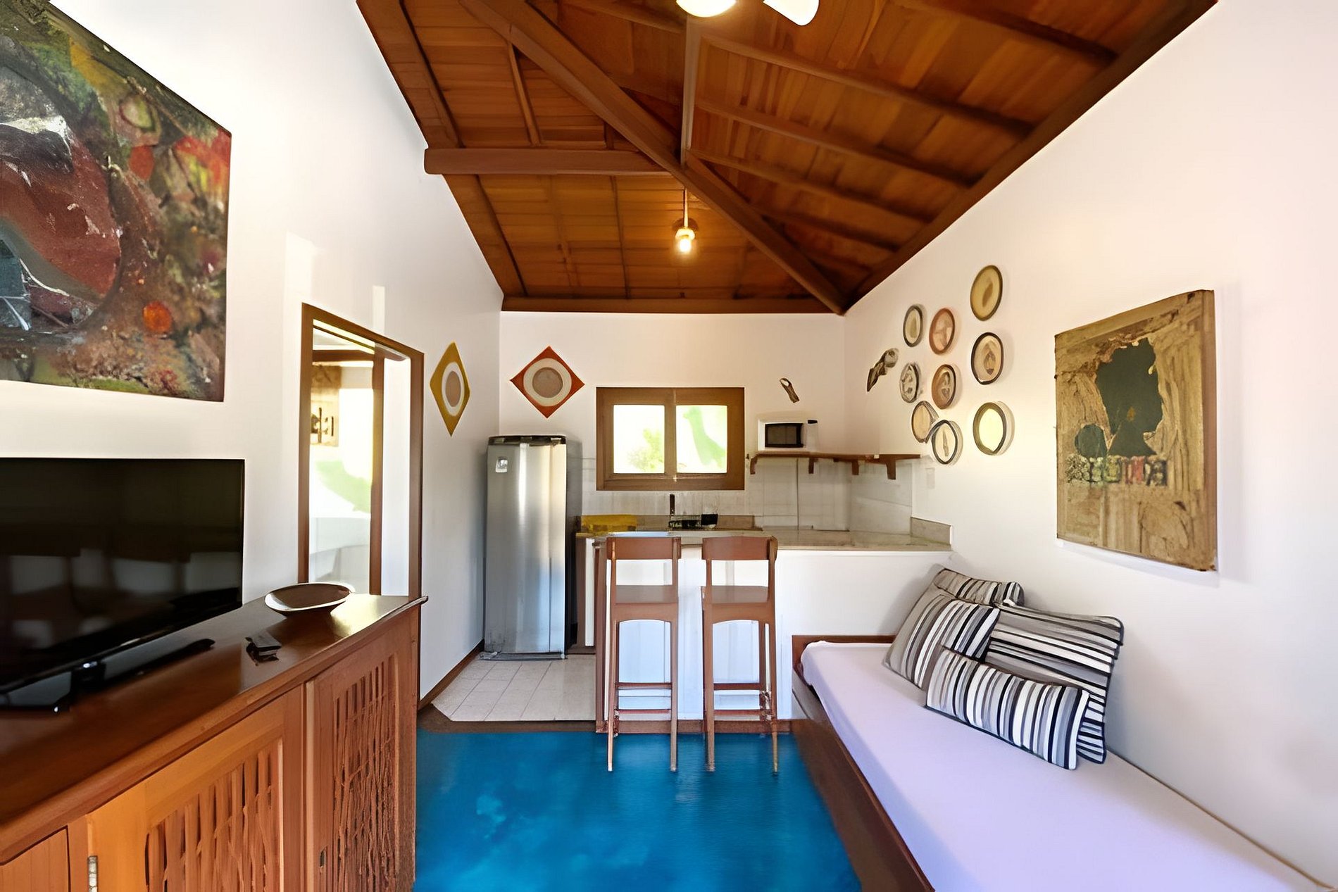 Apartamento superior com saida direta na praia ideal para casal e filhos a beira mar completo de cozinha equipada , um quarto com cama de casal com ar condicionado , banheiro social, sala com sofá bi-cama com dois colchão de solteiro e ventilador de teto , varanda com vista para a piscina .